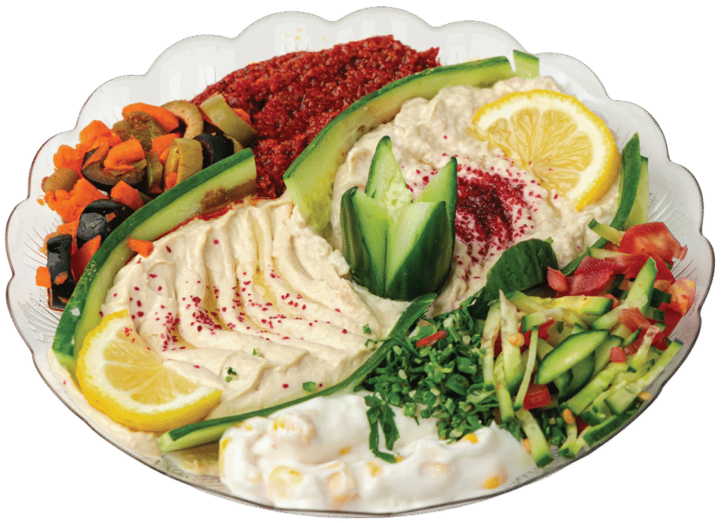 طبق كبير يحتوي على تشكيلة متنوعة من المقبلات الشرقية، مثالي للمشاركة على المائدة